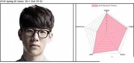 雷达图上面的数据代表的是10分钟对位的场均领先数据,右上方是10分钟补刀领先数据,右下方是伤害占比,左下方是分均输出,这四项数据The Shy都是拉满的一个状态,证明The Shy又重新变成了之前的那个风格。