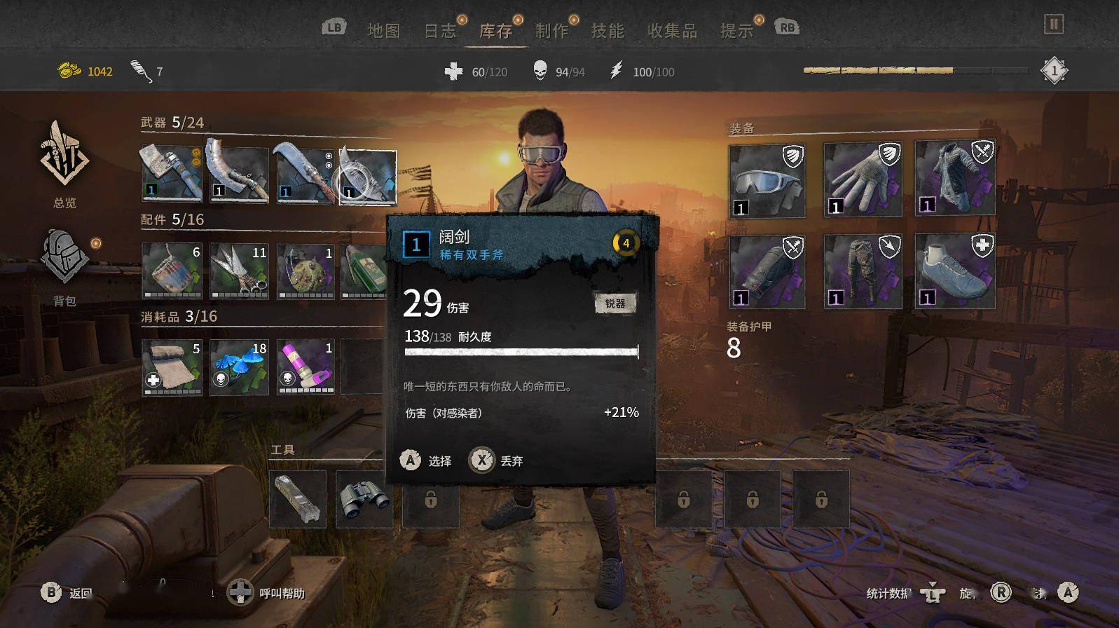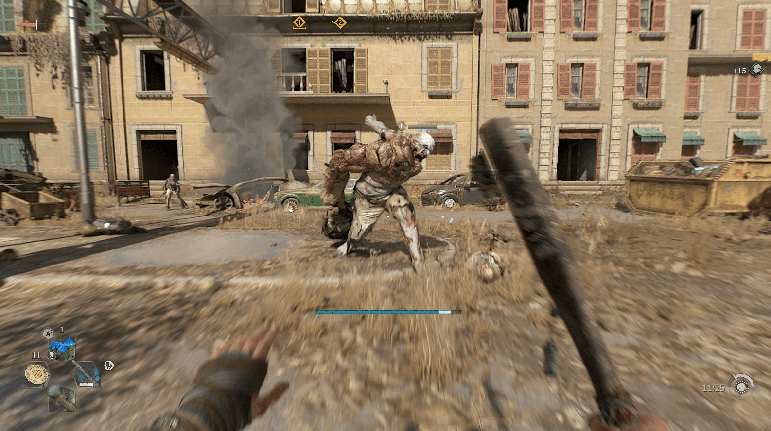战斗方面的手感还是简单直接的。我预感到我手里的大砍刀可能会用很久,因为它太好使了,前后踱步+下三路的策略对付大部分敌人都没问题。吐酸水的僵尸和投掷射击的人类不好对付,其他情况只要不被包围就不算太棘手。招架+飞踢的打法非常强力,而且招架的判定很宽松,这一招对付人类特别好使。我目前还没有和夜魔之类的强力敌人交过手,目前打过的主线之外的特殊怪有一个抡铁锤的大壮儿给我留下很深印象,是起手就AOE的那种,但稳妥着点打也并不难。