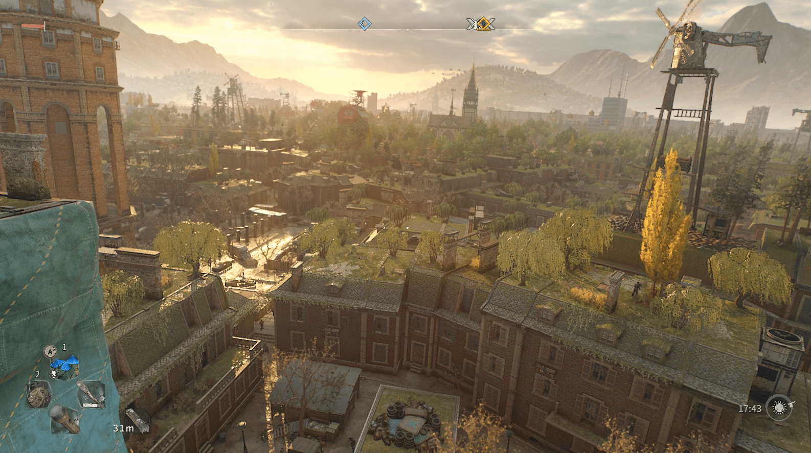 一代距今已有七年之久,用七年做一部续作,它的主要改变是什么?回顾我的第一印象,我觉得首先是“屋顶”。这一直是跑酷戏份很重的游戏,当然一代的“屋顶”也很重要,但这一代中,屋顶给了我前所未有的归属感。一张奇大的、自由的地图(据官方介绍面积是前作四倍),有了新的画质和场景构造,让我的体验中,只要抬头远望,都想再多停留几秒。我觉得它这次算是把“末世氛围”给彻底玩明白了,这样一个世界不一定是灰暗的,而是鲜艳的、美的,就像其中一个NPC的台词,到处都完蛋了,但还有“值得留恋的美景”,而当另一个NPC说,他的梦想是找一个地方建一所房子藏起来,结合这些景象也让人有所感触。