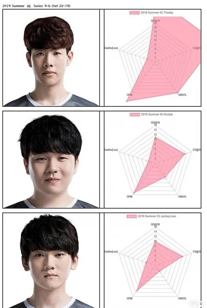 Rookie的这个五芒星,也是在对线压制上的两项数据超出格子,但是相比于前面的The Shy,Rookie的死亡数是极低的,因此在五芒星的这个数据上,他是没有任何短板的。