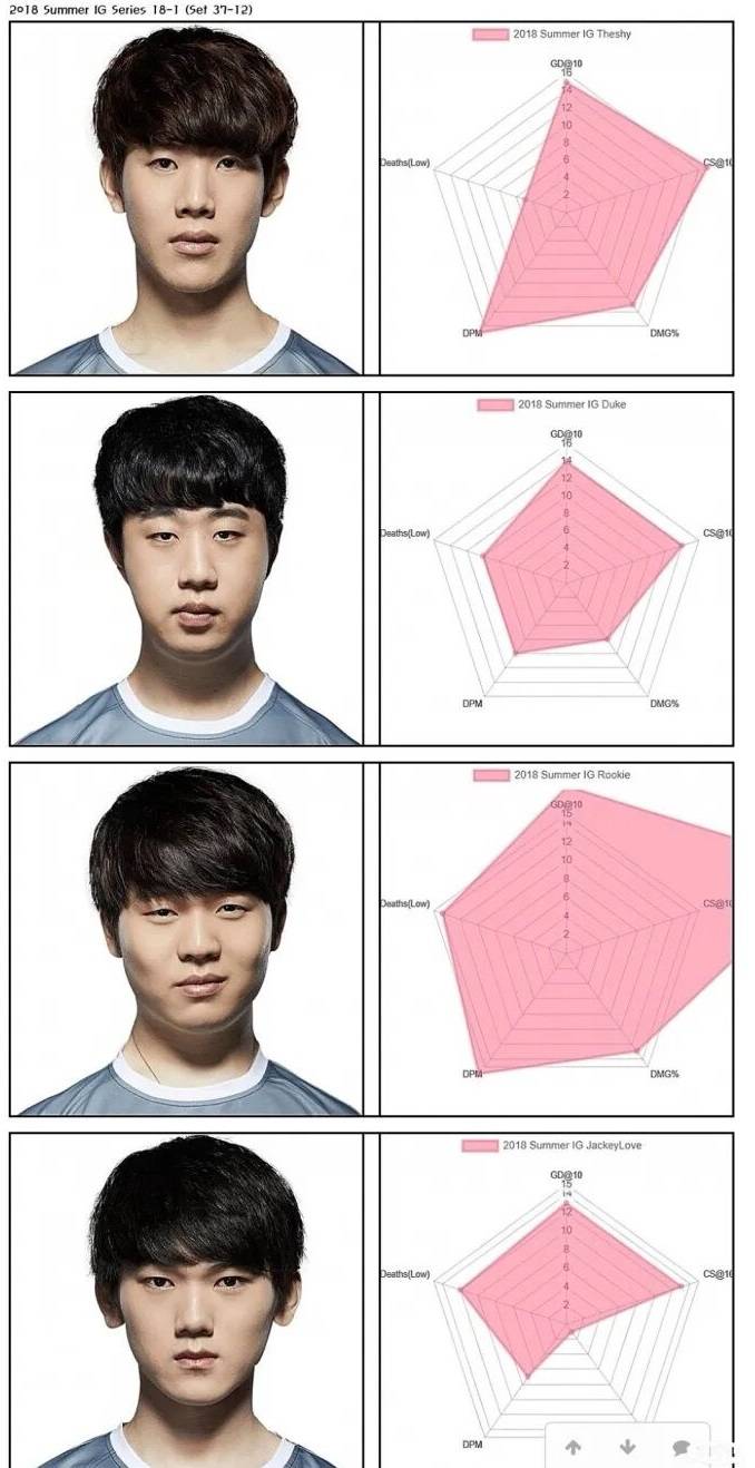 The Shy的这个数据图已经非常吓人了,但事实上在S8年夏季赛Rookie打出过更加恐怖的雷达图数据表现,Rookie的风格和The Shy是有一定程度的相似之处的,也是对线压制能力拉满操作拉满的选手。