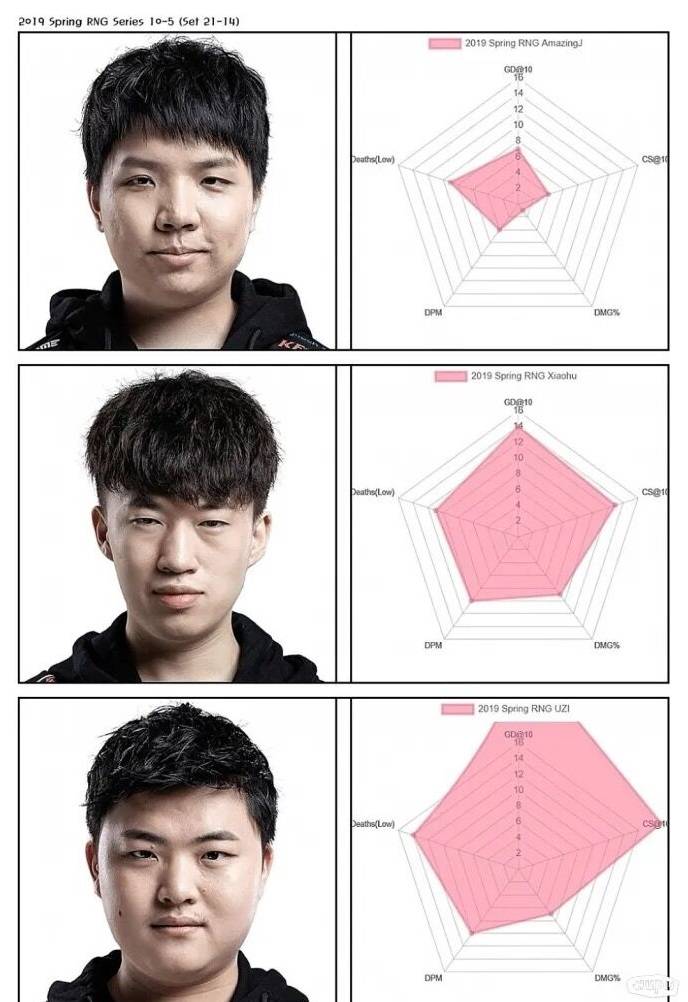 需要注意的是2019年春季赛的Uzi,其输出占比并不高,但是对位的补刀压制和对位领先是非常高的。