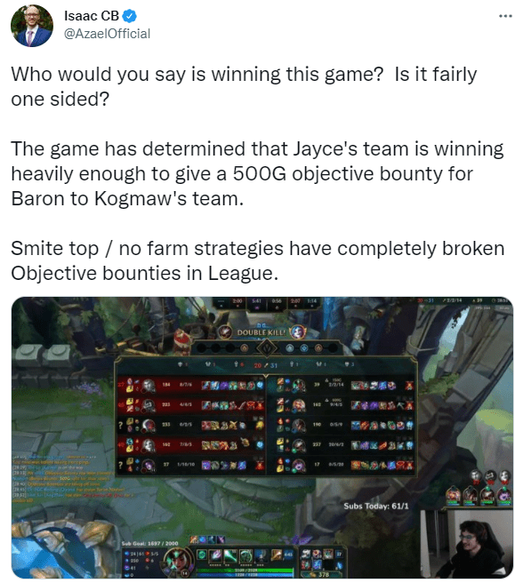 最重要的是,由于迦娜太穷会触发落后的赏金,一旦拿到赏金的话,己方拿到防御塔和龙就会有额外收益。对方就很难在中期扳回局势,己方可以利用快速的节奏来击败对手。而这个套路可以延伸到其他的辅助英雄,外服已经出现了上单卡尔玛的套路,英雄联盟官方解说Azael在推特上就讨论过这个情况,蓝色方落后10个人头和2条小龙,居然还有战略点赏金。