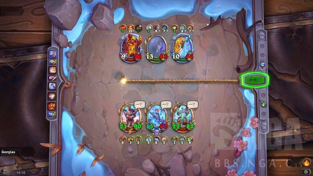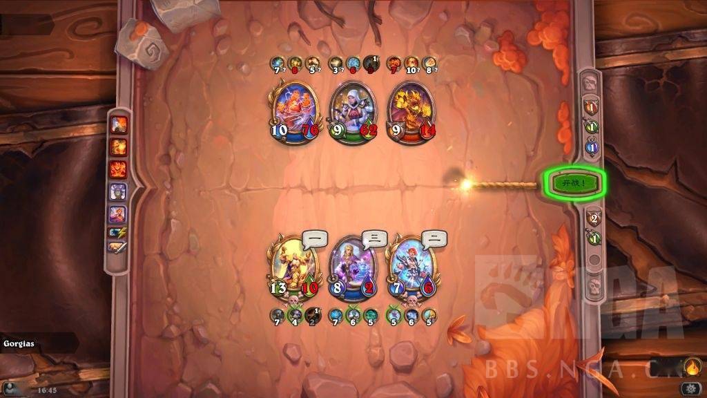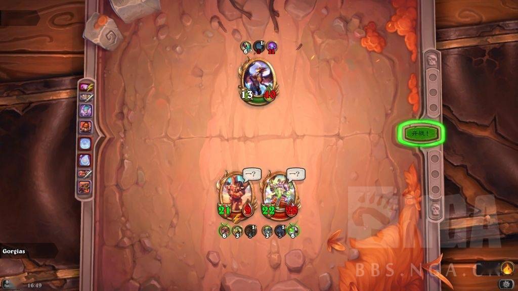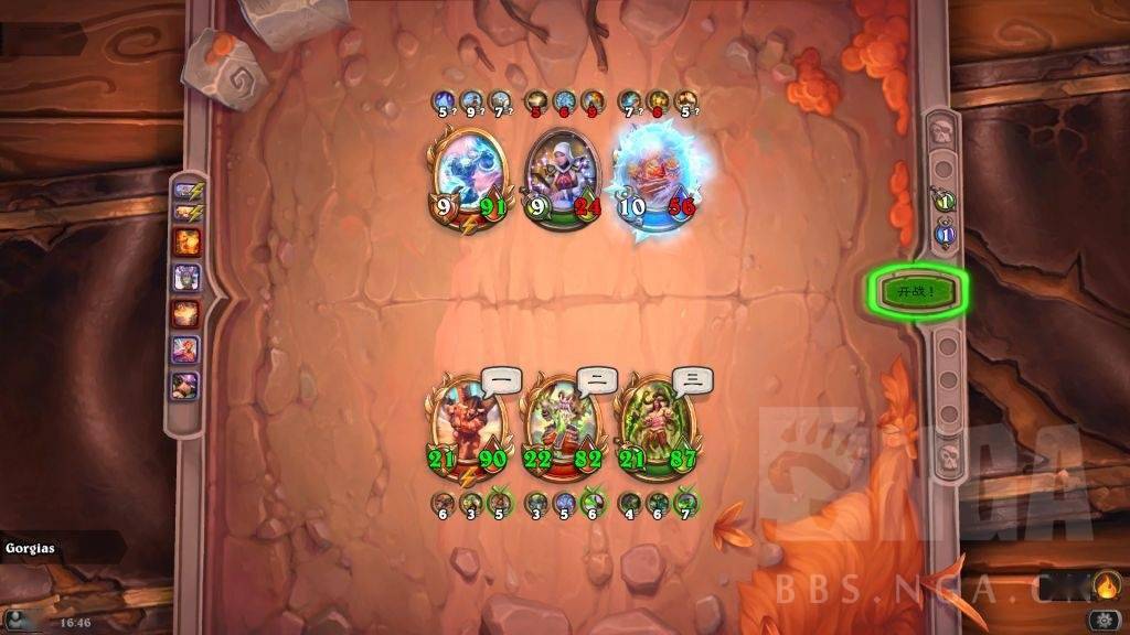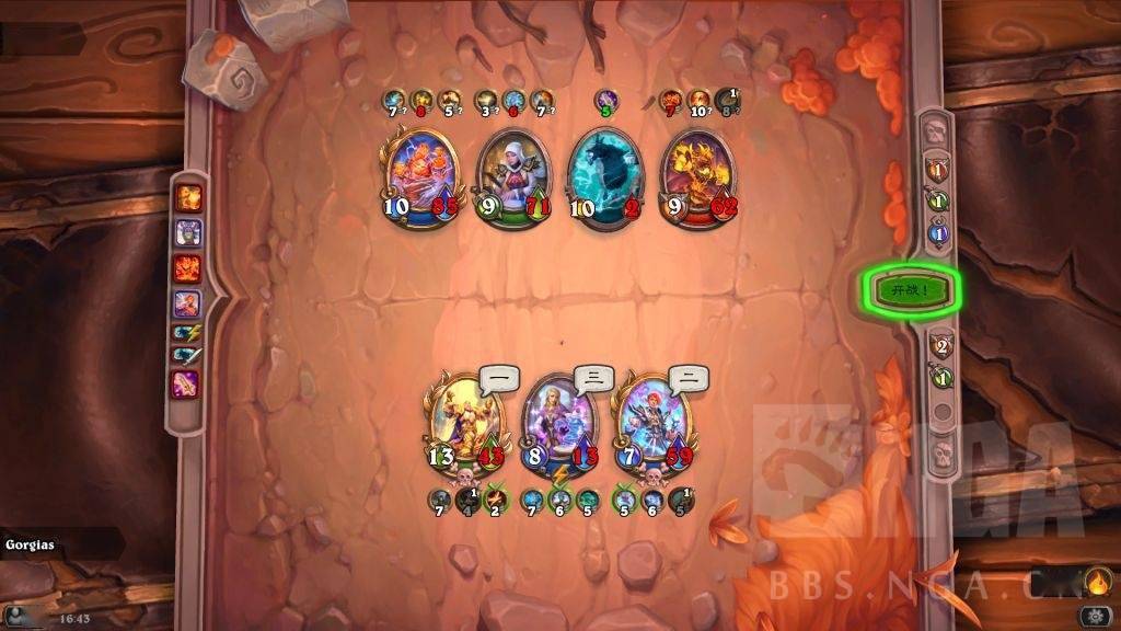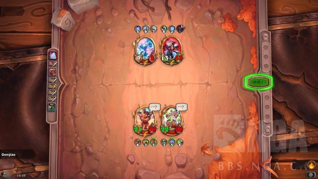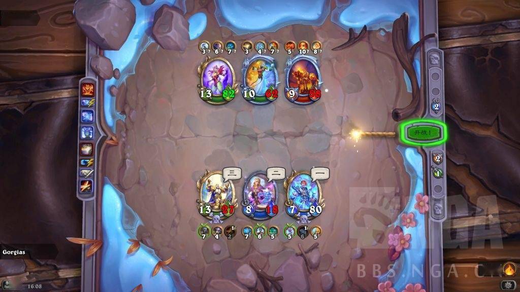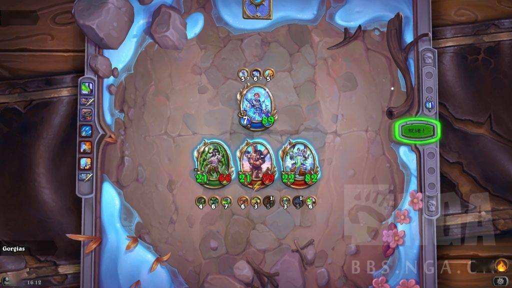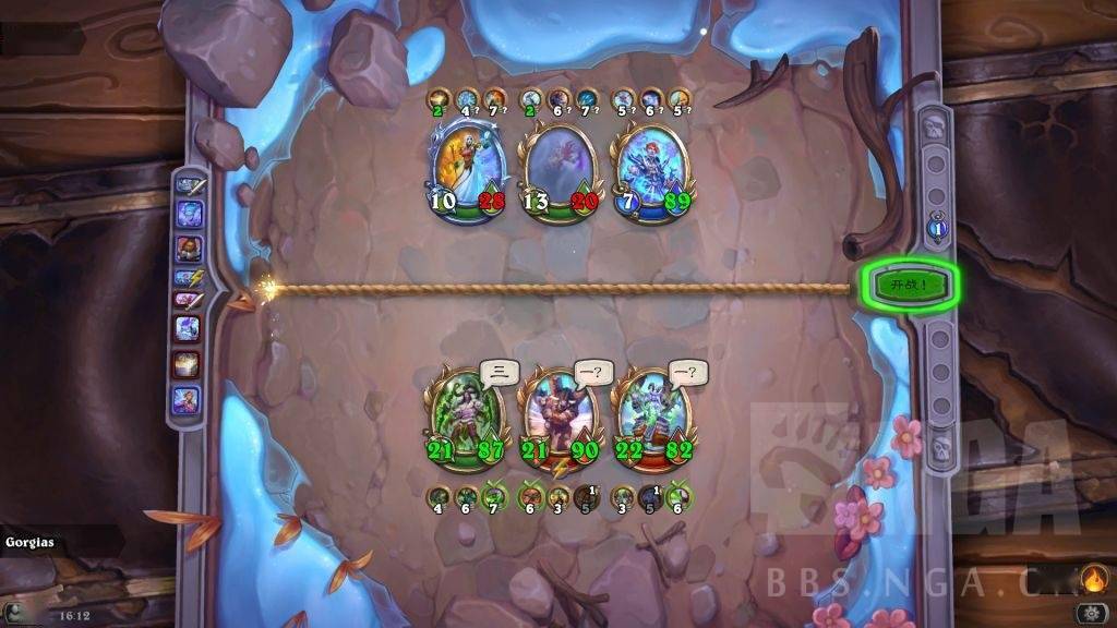 这时存在一个对方巴1和我方晨拥1的拼5速。对方肯定想趁螺丝在场杀晨拥,如果先杀吉安娜,被我晨拥2打死螺丝,那就要被我晨拥亡语冰冻了,而且还怕我弗丁4速2技能给吉安娜。