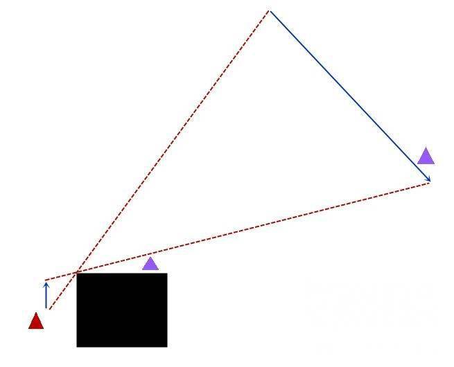而往往这种操作是在中远距离才能做出的,就是我从掩体挪出来一米,我的视野要增加十米……嗯手绘个图……红色三角是我,紫色是近和远两个敌人,虚线是视野,蓝色箭头是我移动多少距离就可以增加多少视野。