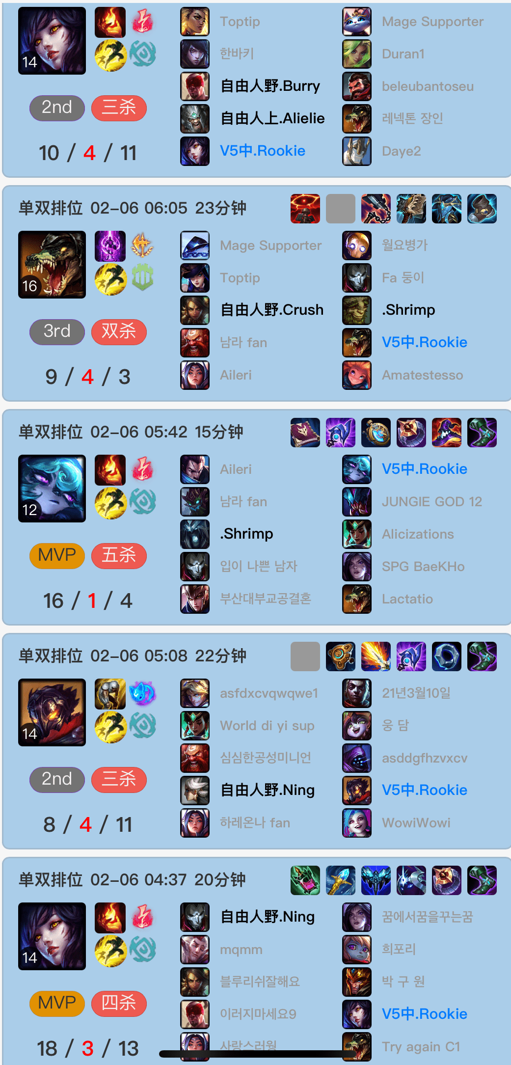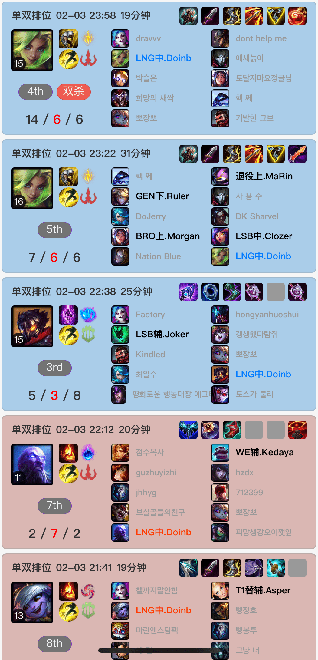 Doinb这边则在疯狂地练习中单泽丽的打法套路,但是相比于Rookie来说,Doinb泽丽的胜率就比较低了,而且玩泽丽的时候有几场阵亡数量比较多,但能看得出来Doinb确实挺喜欢用这个英雄打中单,目前仍在摸索和提升熟练度的过程中。