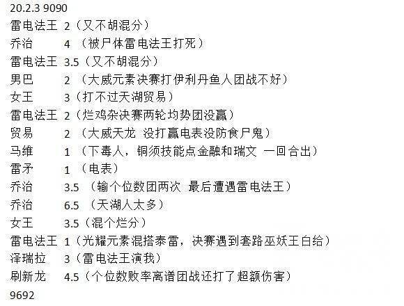 上面排序是大数据排名,我个人排名 女巫妖>狗头女王>穆克拉>刮痧>刷新龙。附一下最近几天的战绩记录,9000多分前冲了3天当时没想着记录。