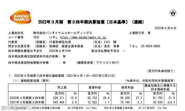 万代南梦宫今日公开21-22财年Q3(4月~12月)财报,截止至该季度末销售额6283.11亿日元,同比增长15.6%,营业利润921.53亿日元,同比增长26.4%。