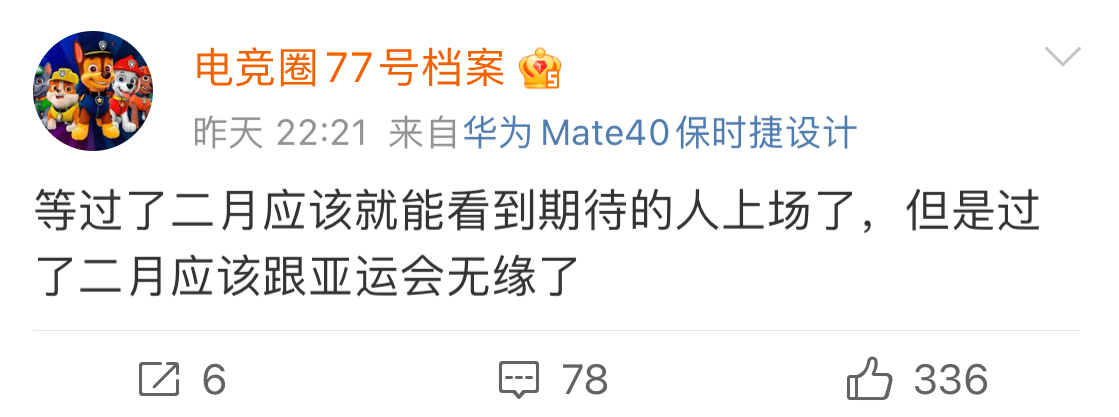 昨天77是在微博上发了一个消息说等过了二月份就能看到期待的人上场了,但是过了二月应该和亚运会无缘了。