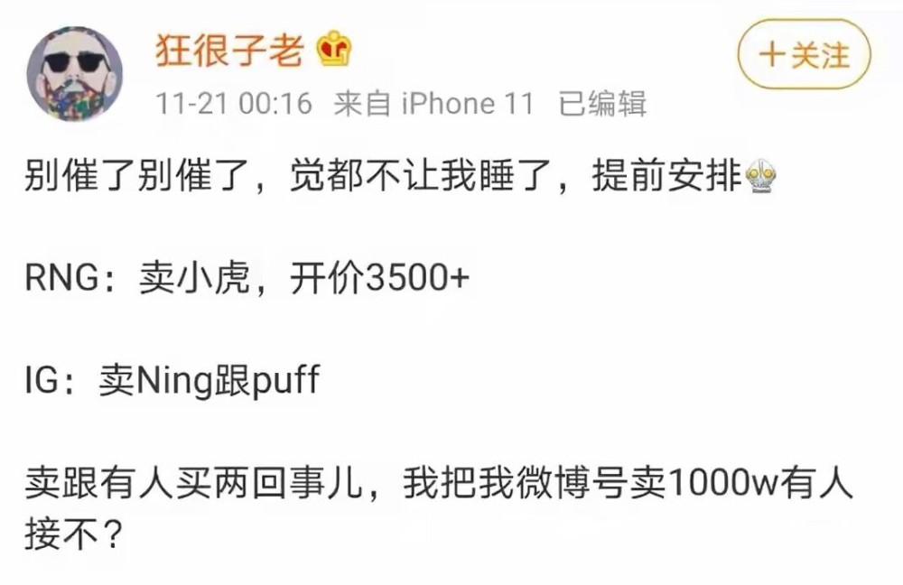而且RNG战队开出的价格是3500万,一个天价的数字,除了这个爆料之外,这位圈内人士还表示IG战队将会出手Puff和宁王两个选手。
