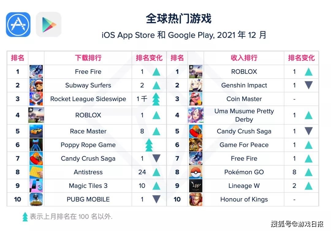 【《Roblox》成为全球收入最高手游】 App Annie发布2021年12月月度指数排行榜。下载榜方面,Sea旗下的《Free Fire》位居全球下载第一,《PUBG Mobile》下降至第10。收入榜端,《Roblox》反超《原神》上升至第一。