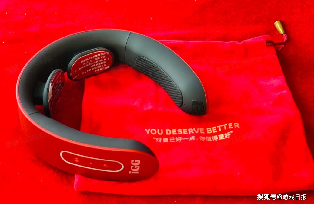 先把坚果礼盒放一边,主要来看看这台按摩仪,装在一个红色布袋之中,布袋上面印有一句“对自己好一点”的暖心提示语,拿出之后会发现是一台小巧精致颈部按摩仪,上面印有IGG公司LOGO,整体看起来十分简约大气,而具体使用感受嘛,游戏日报君只能说两个字“舒服”。