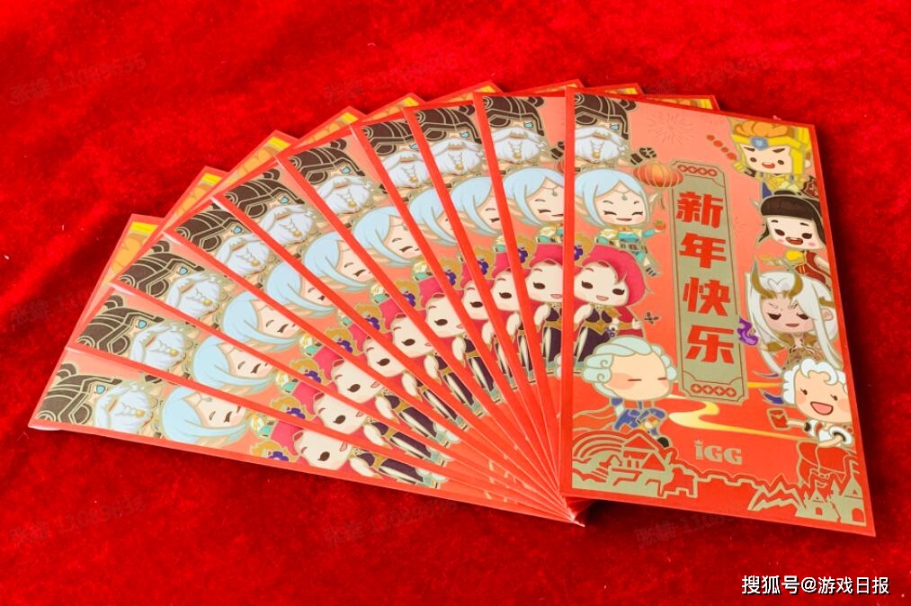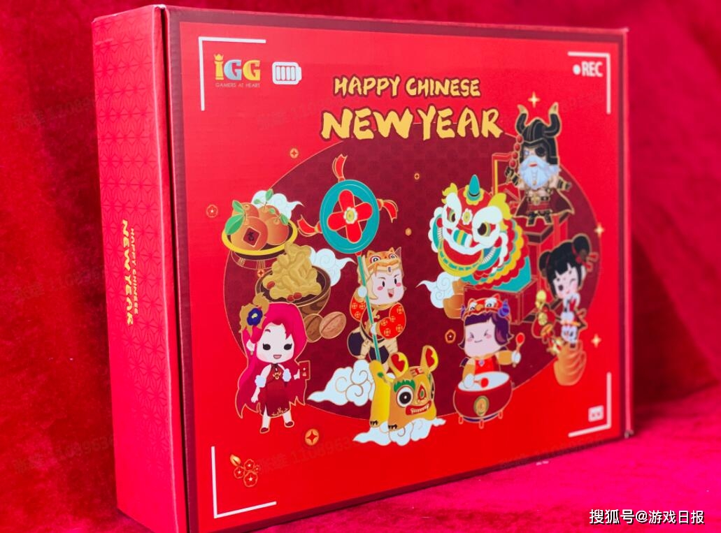 首先是外包装,大红色的包装盒设计整体看起来十分喜庆醒目,而在外包装盒的细节上,除了印有IGG公司LOGO之外,还有“Happy CHINESE New Year”的新春祝福字样。值得一提的是包装盒上嬉戏打闹的Q版角色,都是IGG旗下产品中的人物扮演而成哦,这样的细节设计非常用心。