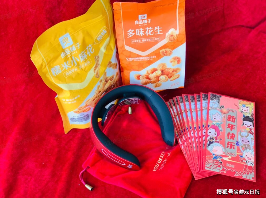 打开外包装盒,会发现礼盒中主要有3部分物品,第一部分是一盒红包,红包上面同样印着自家旗下产品Q版角色图案与“新年快乐”字样,十分喜庆。除了常规的新春红包之外,还有一大袋坚果礼盒与按摩仪! 对,各位没有看错,在这个礼盒中IGG居然放了一台价值不菲的颈部按摩仪。