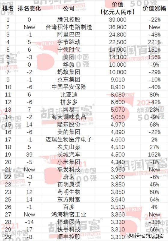 【腾讯蝉联胡润百富榜非国有企业第一】 胡润研究院发布《2021胡润中国500强》(非国有企业),虽然2021年市值跌去了1万亿,但腾讯仍以3.9万亿的市值蝉联中国价值最高的非国有企业。阿里巴巴市值跌去近一半,下降至第3名,字节跳动价值增长3倍,排名上升至第4。此外,网易上升4位来到第13名。