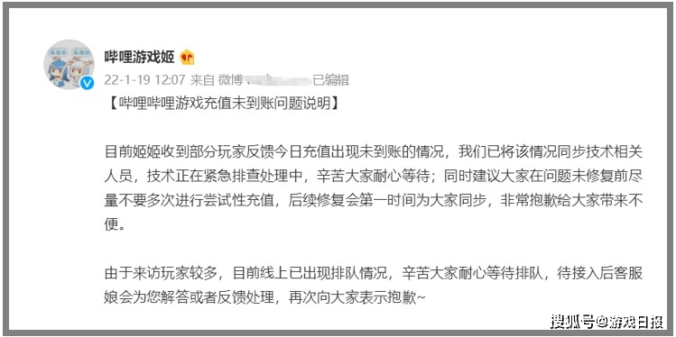 【哔哩哔哩游戏充值系统出BUG】 哔哩哔哩游戏客服发布公告称渠道上部分游戏出现了充值未到账的问题,包括《偶像梦幻祭2》、《坎公骑冠剑》、《古剑奇谭木语人手游》等多款产品受到了影响,目前这一问题已修复。