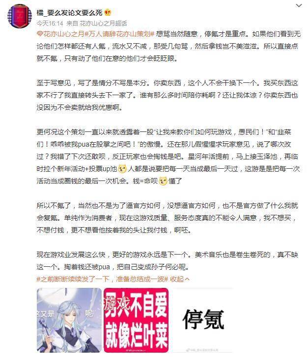 在“万人请辞花亦山策划”话题下,有不少《花亦山心之月》玩家将一些他们认为不合理的行为列举了出来,另外还有玩家号召大家即日起停止氪金,并且更改微博头像。为何一个小小的活动预告能够引起这么大的反应,也有《花亦山心之月》玩家透露主要是长久以来的“积怨”。