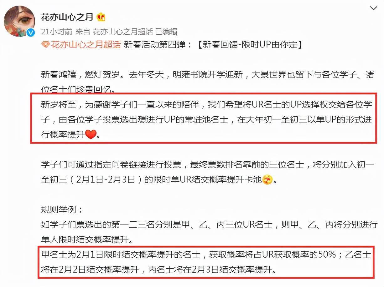 那么到底是什么原因,让《花亦山心之月》的玩家们将矛头对准策划呢?经过了解,其主要争议点出现在《花亦山心之月》曝光的新春活动第四弹,活动本意是让玩家选择UP名士(角色)融入到春节期间的卡池之中,提升概率让玩家抽取,但没想就是这样的一个设定,却引起了不少玩家的不满。