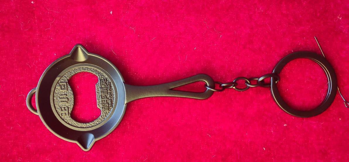 这个平底锅比较好玩的是中间并非完整的,一开始我还没搞懂有啥用处,后来旁边比较喜欢喝酒的同事说应该能拿来开啤酒,还是实用性比较强的。后面那根针没分析出来是做什么的,大概率是方便将这个挂件和钥匙更容易串起来。