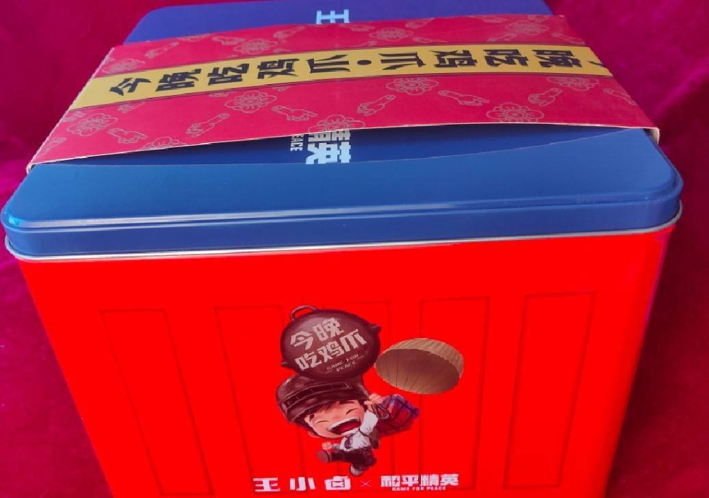 这个礼盒的外观比较简单,就是个空投样式的铁皮盒子,里面的结构也是空的,没有特殊的层次安排。外表上有个比较有趣的标语“今晚吃鸡爪”(王小卤主打的就是虎皮凤爪,刚刚尝了一下,味道确实不错),对和平精英的玩家来说多少有些梗的既视感。