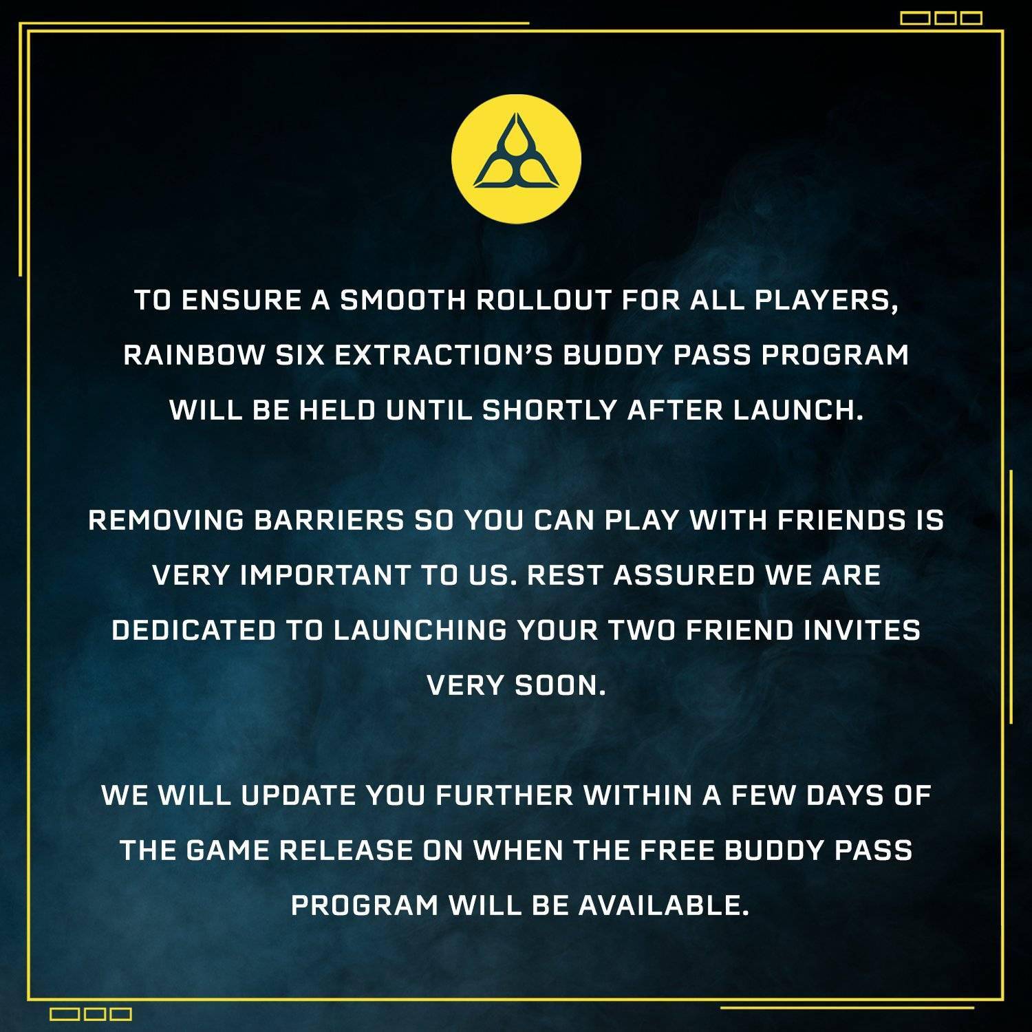 除此之外,《彩虹六号:异种》官方今日(1月19日)还发布公告表示,为了保证所有玩家的首发游戏体验,团队将会在游戏发售后不久推出朋友通行证。此朋友通行证可以让已经购买游戏的玩家邀请两个朋友一起游玩。