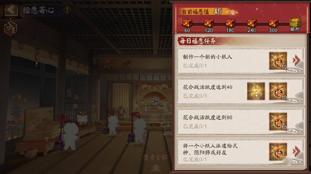 大人可通过完成每日福愿任务获取福愿,福愿任务每日0:00点更新。当积攒的福愿达一定数量时即可收到小纸人们的赠礼:神秘的符咒、四星奉为达摩、大蛇的逆鳞、随机小纸人外观等,更可获得终极奖励「纸愿绘梦函」。