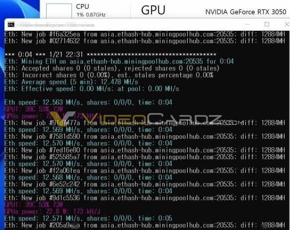 NVIDIA在RTX 3050显卡中加入了LHR算法限制,使该显卡的算力会在几秒内从20MH/s降低到12.5MH/s,比应有水平至少损失40%甚至50%的挖矿性能。也有网友对其挖矿性能进行优化,优化后的算力略微提升,为13.66MH/s。