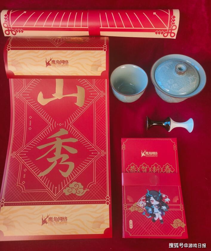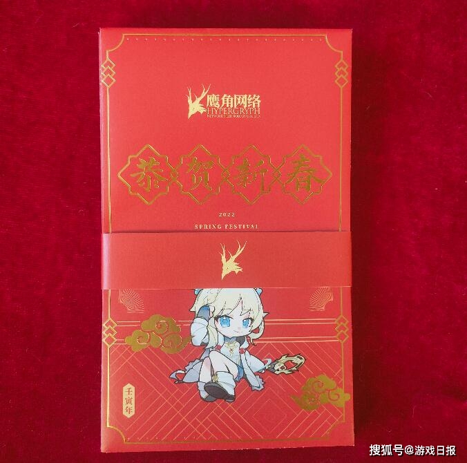 打开礼盒,映入眼帘的是一张鹰角网络的新春贺卡,上面写着一些祝福语。另外,里面的事物主要有5件东西,比如常规的红包、对联、福字贴,在红包上面还印有一些卡哇伊造型的人物角色,也是鹰角旗下产品的角色形象。