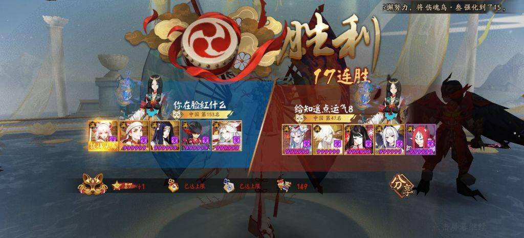 主力式神:离、食、切、白、鸦、千姬、腹肌(应对大多数阵容)