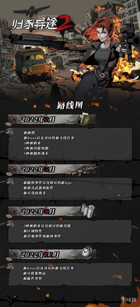 目前官方也公布了2022年开发计划路线图,如下所示。限于团队规模,《归家异途2》暂时还不加入创意工坊功能。