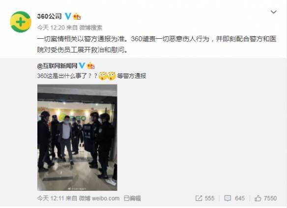 今天(1月25日)有微博账号发文称:“360这是出什么事了?等警方通报 。”。360公司官方微博随后转发回应:一切案情相关以警方通报为准。360谴责一切恶意伤人行为,并即刻配合警方和医院对受伤员工展开救治和慰问。