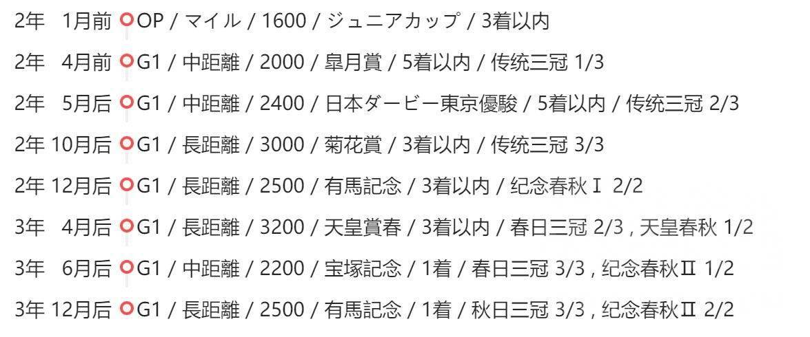要点:非常简单的达成条件,宝冢和有马是剧情保送,翻车点主要集中在菊花赏被麦昆背刺,建议跑到菊花赏的时候点上白回复然后切到先行再跑翻车率低一点。