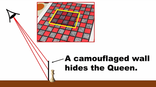 纸板在特定角度下,身上的图案能完美地与棋盘花纹重合,所以可以误导我们认为棋盘上是空的。
