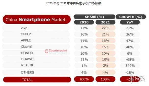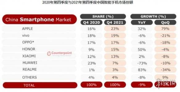 据报告显示,在2021年第四季度,苹果以市占率23%的份额位居首位;vivo以市占率19%的份额位居第二;OPPO以市占率17%的份额位居第三;荣耀以市占率15%的份额位居第四;小米以市占率13%的份额位居第五。而在全年的市场数据中,vivo以市占率22%的份额位居首位;OPPO以市占率21%的份额位居第二;苹果以市占率16%的份额位居第三;小米以市占率15%的份额位居第四;荣耀以市占率10%的份额位居第五。