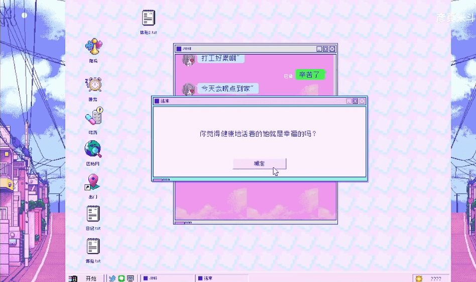 这个结局的名字叫做Labor is evil,根据NGA考据帖,日文版的介绍来自于演歌《红灯笼》,大意是“虽然一个月只能奢侈一次,还是喝了点酒。”我想,以制作者的视角来看,对于糖糖这样的女孩来说,“浅尝辄止”是远远不够的。正如另一个结局中所说,“爱和数据是她最好的解药”,互联网的善意和流量带来的温暖是满足糖糖内心躁郁和空虚的秘方——不管这种温暖是不是虚假的。