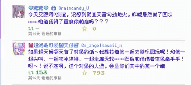 在B站,有许多主播,尤其是虚拟主播在直播实况中对游戏浅尝辄止,与观众的交流很多时候都集中在糖糖和自己的相似性上——这一点是可以理解的。《重度依赖》中的糖糖虽然设定上是真人出镜的女主播,但是其上播先变身的流程、表面推特(哦,是“推博”)和里垢巨大反差同步更新的操作、“中之人”和“皮套”性格完全不同的反差看上去都与VTB的形式更为接近。