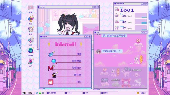 除了直播之外,阿P可以让糖糖外出采风、打游戏、看视频、刷论坛匿名版或是自搜,这些动作除了会影响指标之外,还会为糖糖带来直播的内容和素材:比如,外出采风会增加好感、降低压力和阴暗度,并且触发“买了新的小裙子”的话题,引出“直播试穿”这样的直播内容。除了这些正常行为,游戏也设置了“嗑药”、“做色色的事情”和“约约”这样的选项——自然,它们都是方便的减压手段;但是过度依赖这些手段显然也会导致失控的后果。