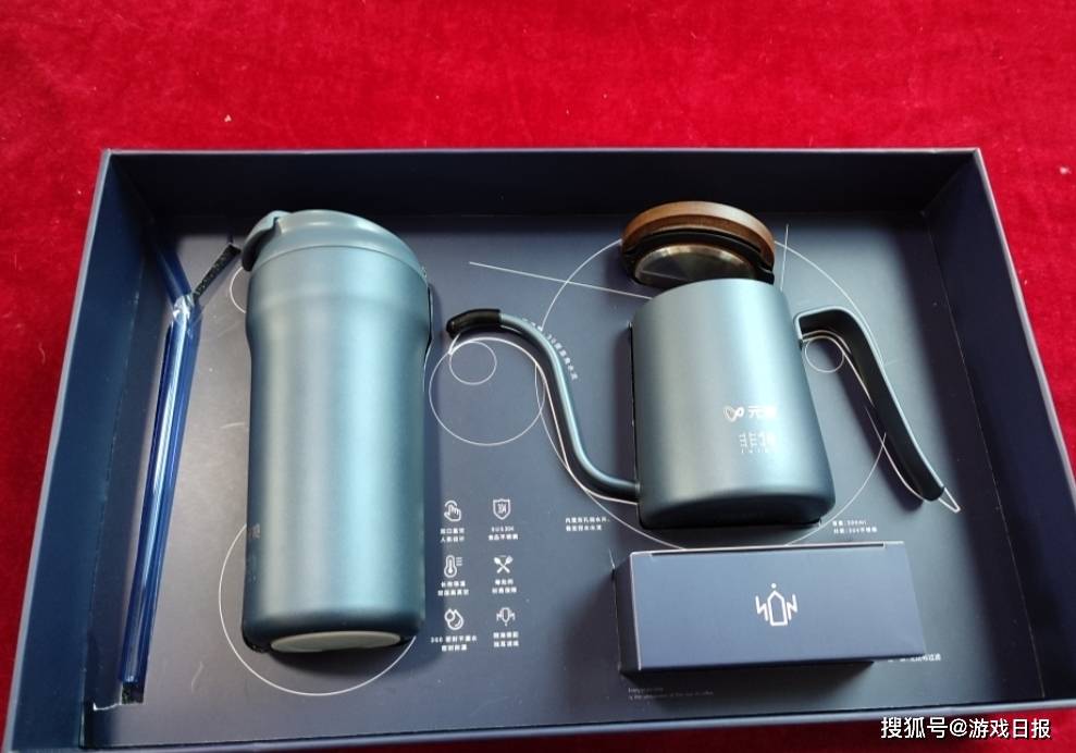 打开礼盒,里面的包装是以深蓝色为主,设计感十足的咖啡壶和外表朴素,不乏线条之美的咖啡杯,吸管、纸巾搭配,简约却很实用。