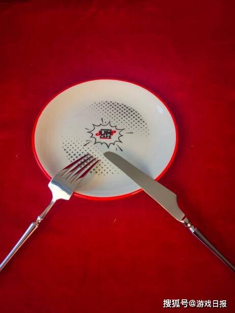 重头戏是这套餐具,红底色的盘子,以及一套刀叉,银光闪闪非常精致。