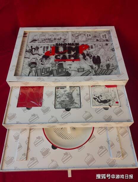 DeNA的礼盒分为三层,第一层是漫画,下面两层可以打开,每一层都装满了礼物。从上往下,第一层是火影忍者、航海王以及七龙珠等动漫图案的餐桌垫,第二层是小礼品,最下面是实用的餐具。