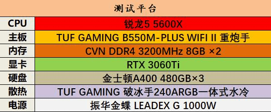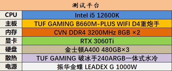 锐龙5 5600X拥有6个核心12线程,而i5-12600K拥有6个大核4个小核共16线程,所以本次测试不进行手动超频,我们的测试平台选择TUF品牌的AMD B550主板和Intel B660主板,都使用DDR4 3200Mhz的内存条,具体配置如下图所示。