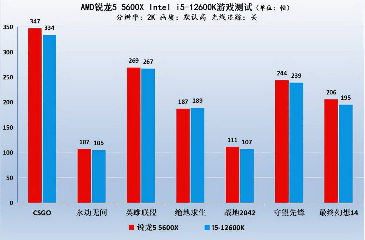 像是AMD传统强势的《守望先锋》和《最终幻想14》里面,锐龙5 5600X依然稳定发力,不管是2K还是1080P都是稳稳超过对手,比起i5 12600K可以高出10~20帧,看来AMD的网络游戏优势确实名不虚传。