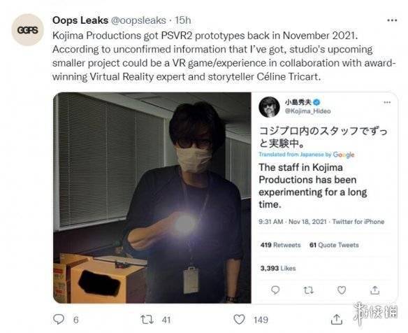 推特用户Oops Leaks爆料说,根据他获得的尚未被证实的消息,小岛工作室下一个小规模项目可能是一款VR游戏,并且是和著名VR专家C%uE9line Tricart合作打造的。他还推测,小岛工作室在2021年11月就已经收到了索尼送出的PSVR 2原型机。