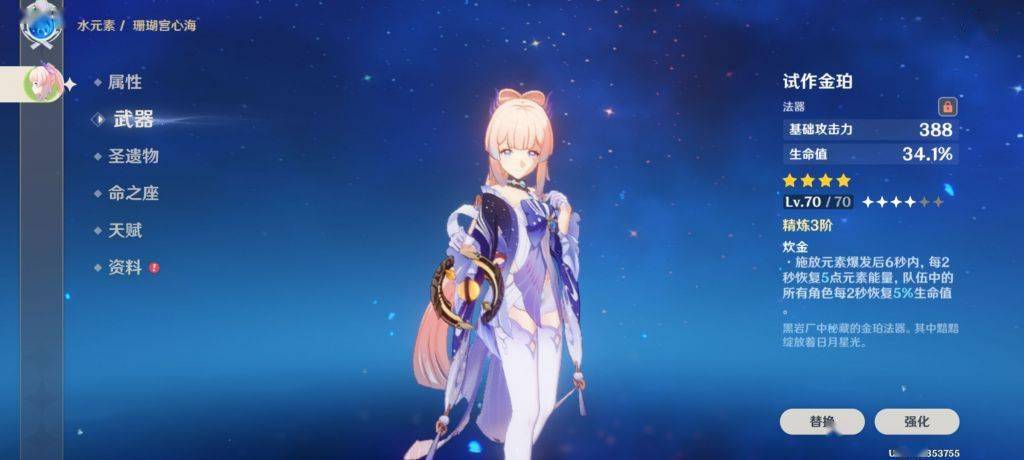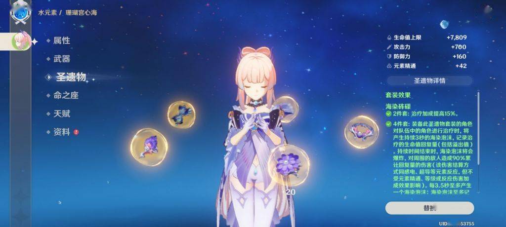 4.挂水工具人金珀心海 常规海染套 需要带充能沙漏 加上金珀的开大回能量 160的充能效率 开大平A直至下个水母CD快好离场 准备进行下一轮输出完全循环的上(只开大不平A可能不够 如果换讨龙可能更不够)。