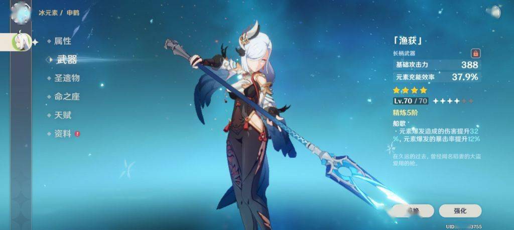 2.副C宗室鱼叉申鹤 选择宗室是因为加大招伤害鱼叉同理 西风枪虽然有额外回球但申鹤段数一般比较难触发 相比甘雨的高频多段大招更建议西风甘雨做充能工具人 充能效率是160 乍一看不够实则不然 和手法有关后面会细说。