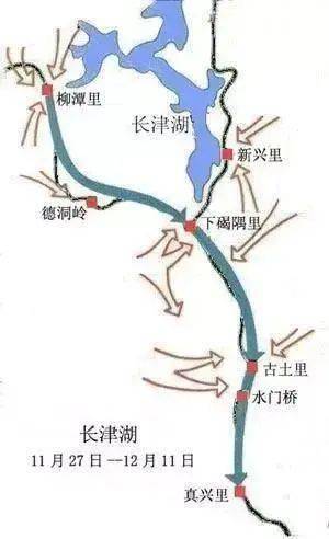 这样,长津湖战场发生转折,美军开始向南拼命撤退,试图从我志愿军的埋伏和阻击中突围。然而,进山容易出山难,撤退之路并没那么容易,从柳潭里、新兴里、下碣隅里到古土里(见地图标注),美军王牌部队经历了“地狱之旅”般的艰难溃退。