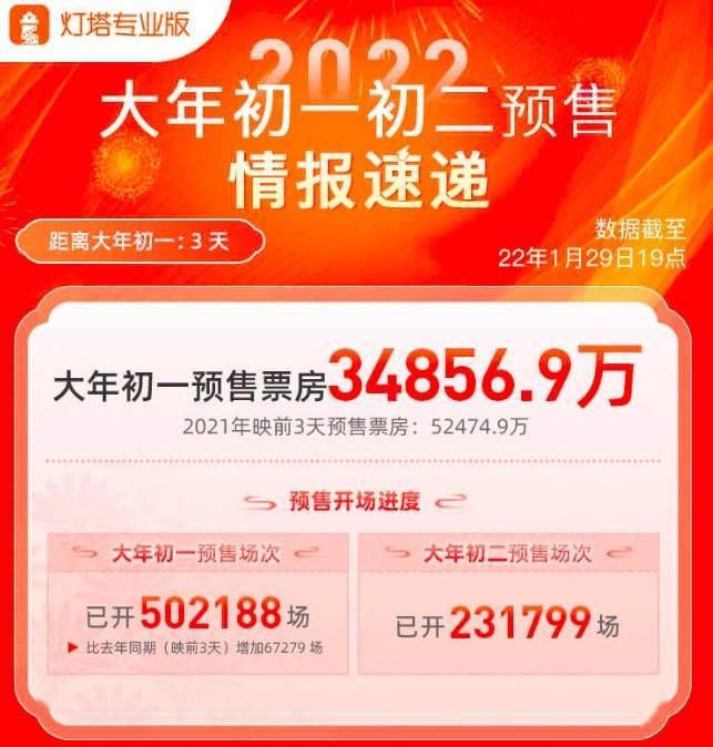 据灯塔专业版数据,截至1月30日17时,2022大年初一院线电影预售场次超52.04万,刷新2019年大年初一创下的中国影史单日场次数纪录,其中大年初一当天预售票房已升至3.9亿元左右。