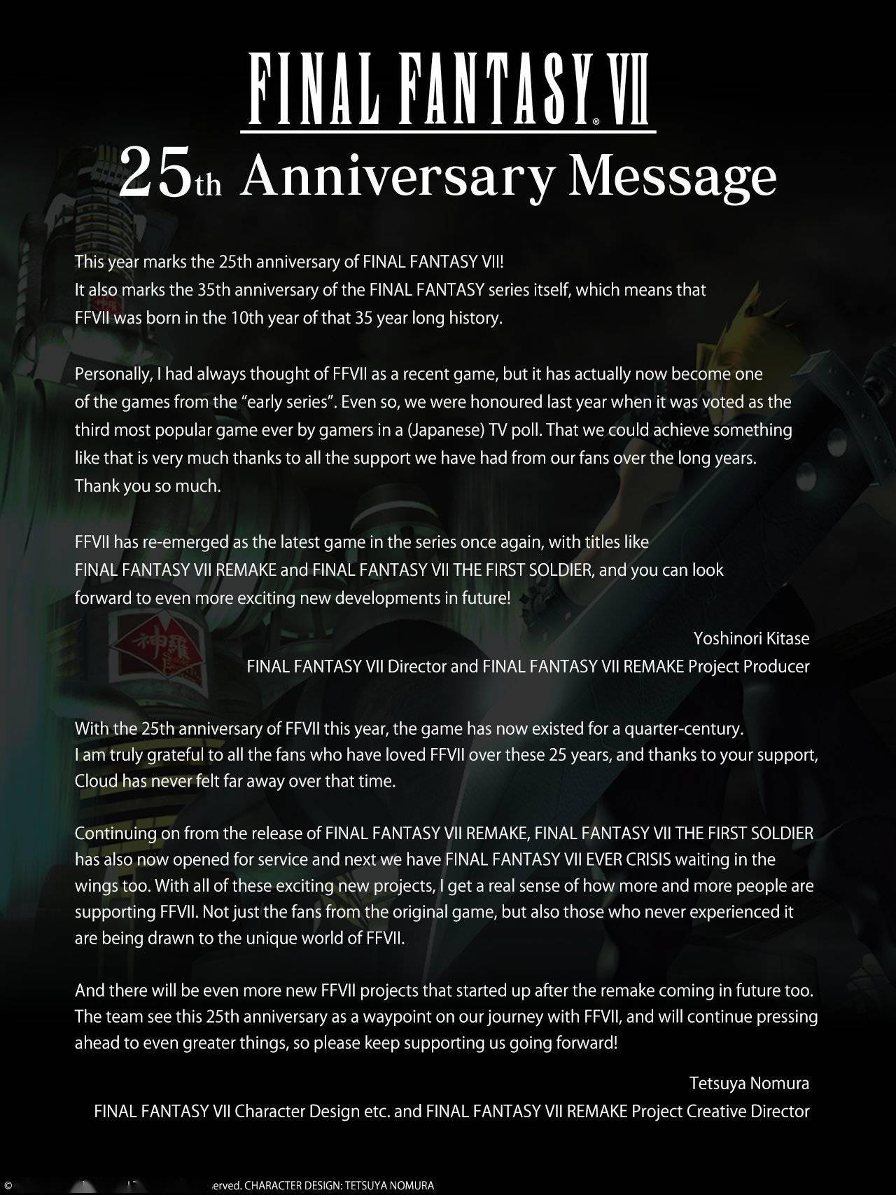 “今年是《最终幻想 VII》问世 25 周年。它也标志着《最终幻想》系列本身的 35 周年,这意味着《最终幻想 VII》诞生于这 35 年历史的第 10 年。”
