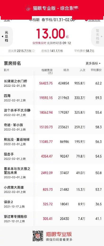 据猫眼专业版显示,在今日(2月1日)13时09分,2022年春节档总票房破13亿!