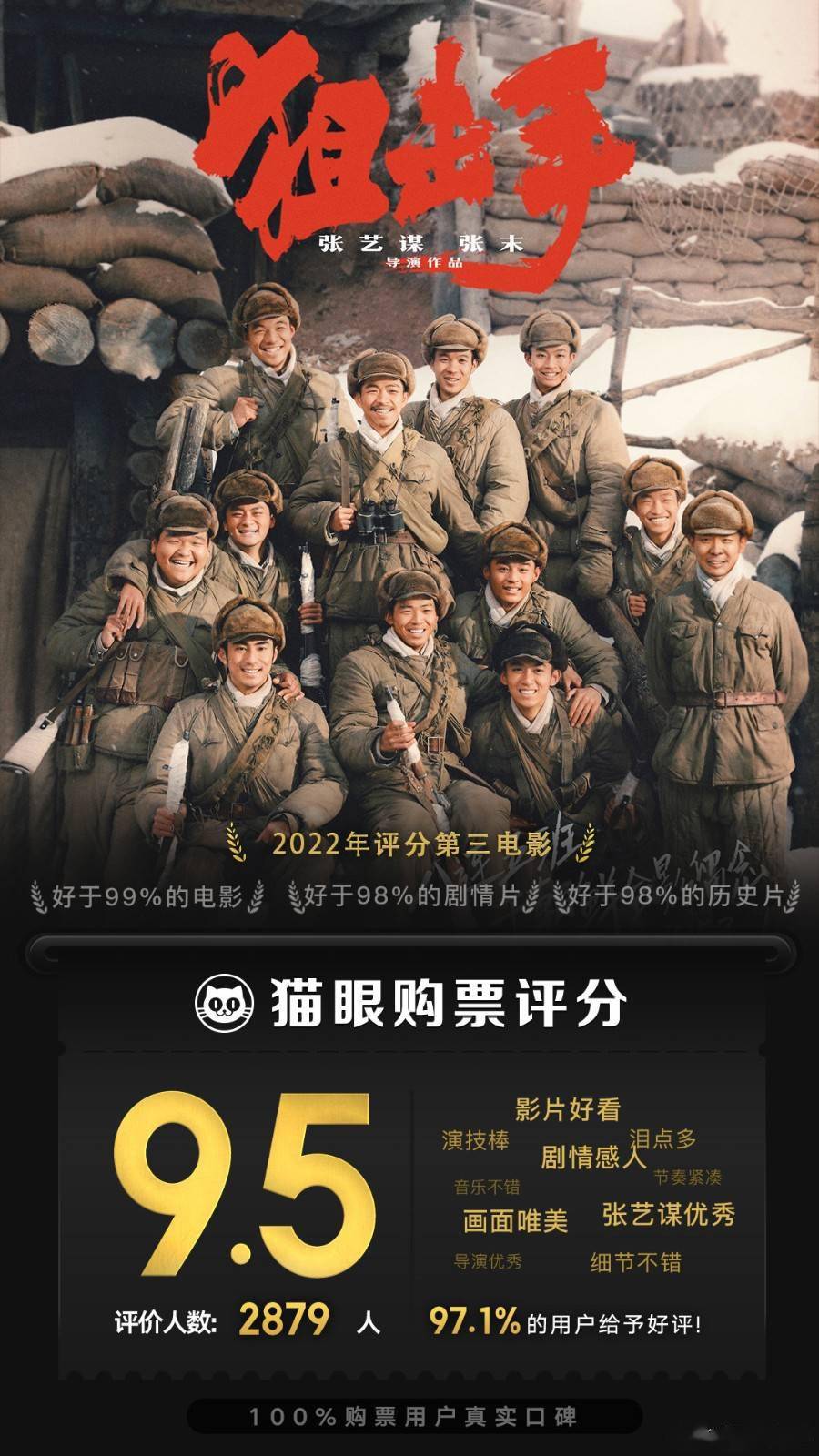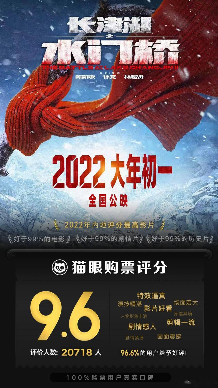 此外,春节档电影已有5部电影在猫眼电影开启评分,《长津湖之水门桥》再次以9.6粪的成绩夺得冠军,拿下票房口碑双料冠军,可以说是双丰收。
